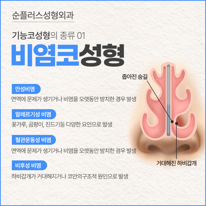 비염코, 비중격만곡증, 비밸브협착, 코뼈골절 등 숨길 기능을 하는 코의 기능적인 부분이 개선되어야 하기 때문에
