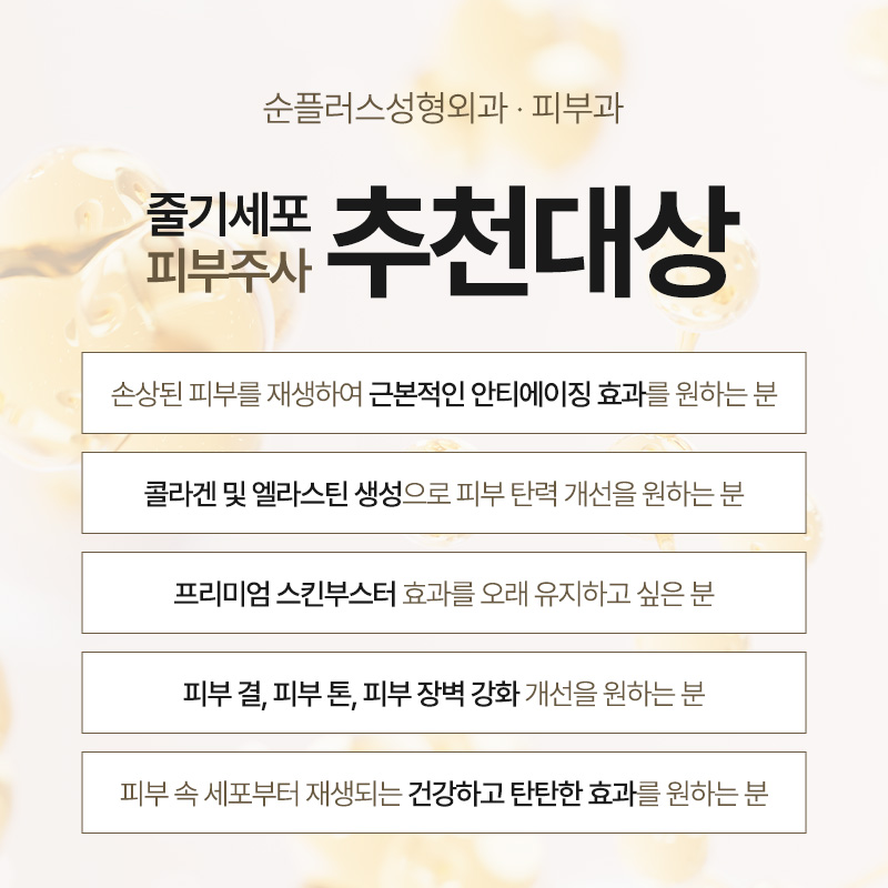피부 속 근본적인 문제를 찾아 치유하고 재생시켜 건강하고 탄력있는 피부로 도움을 주는 시술이 바로 줄기세포 스킨부스터 주사입니다.