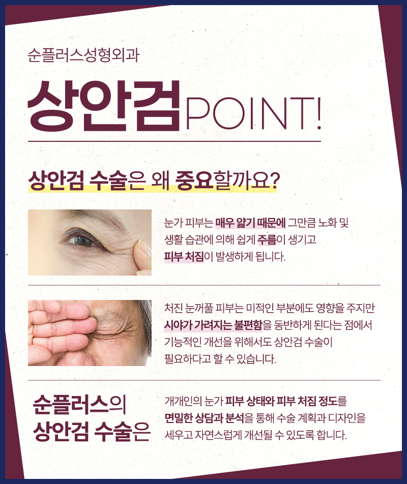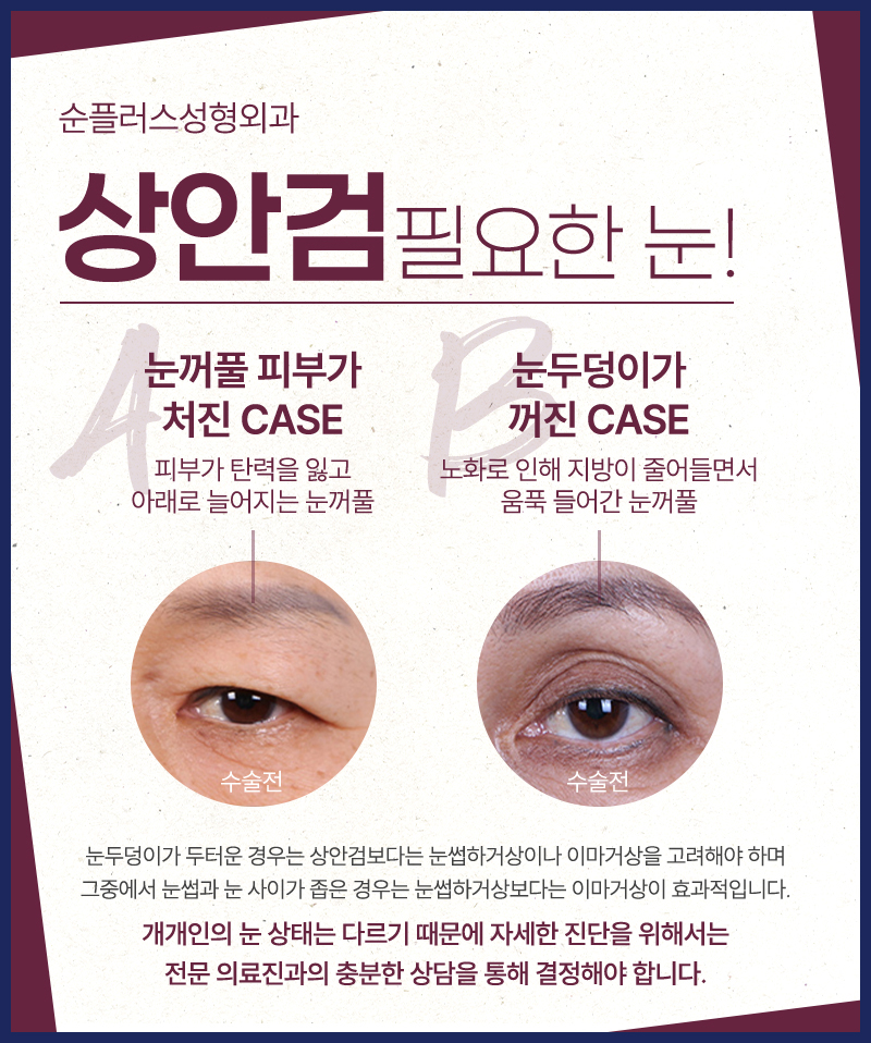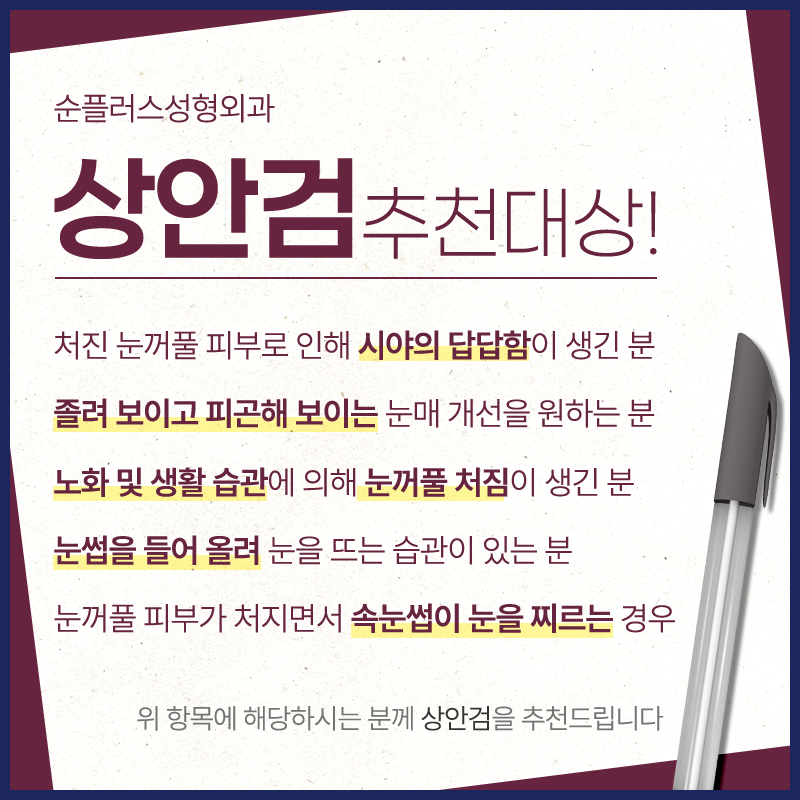 위와같은 증상으로 개선을 원하는 분들은 상안검성형에 대해 상담을 받아보시기를 추천합니다.