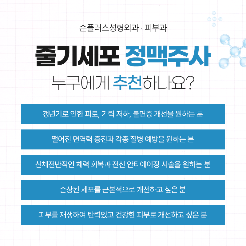 손상된 조직을 재생, 회복시켜 근본적으로 노화를 개선하는데 도움을 주는 시술로 줄기세포 정맥주사를 추천할 수 있습니다.
