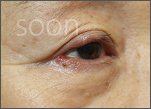 下眼睑线条被切断,且红色的疤痕清晰可见,
