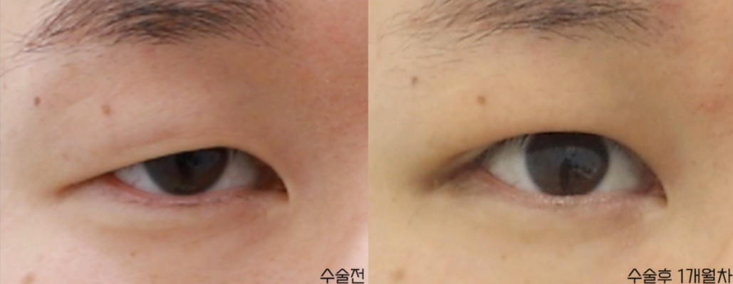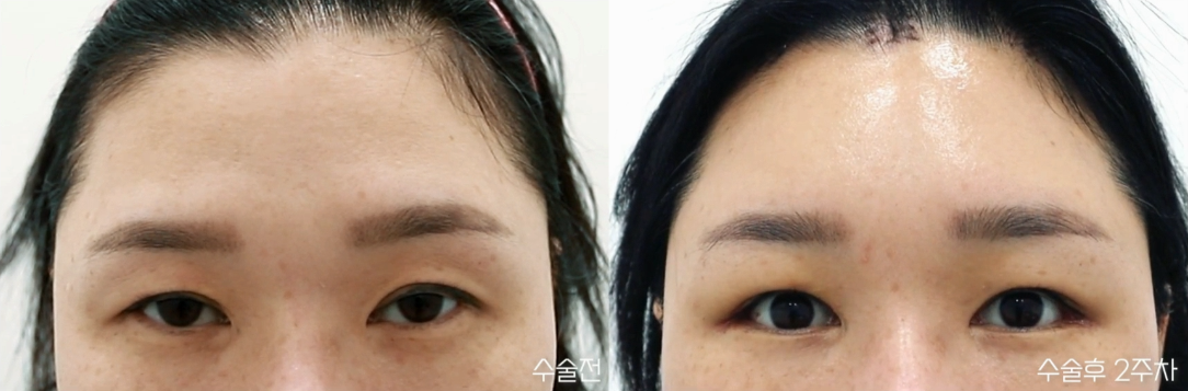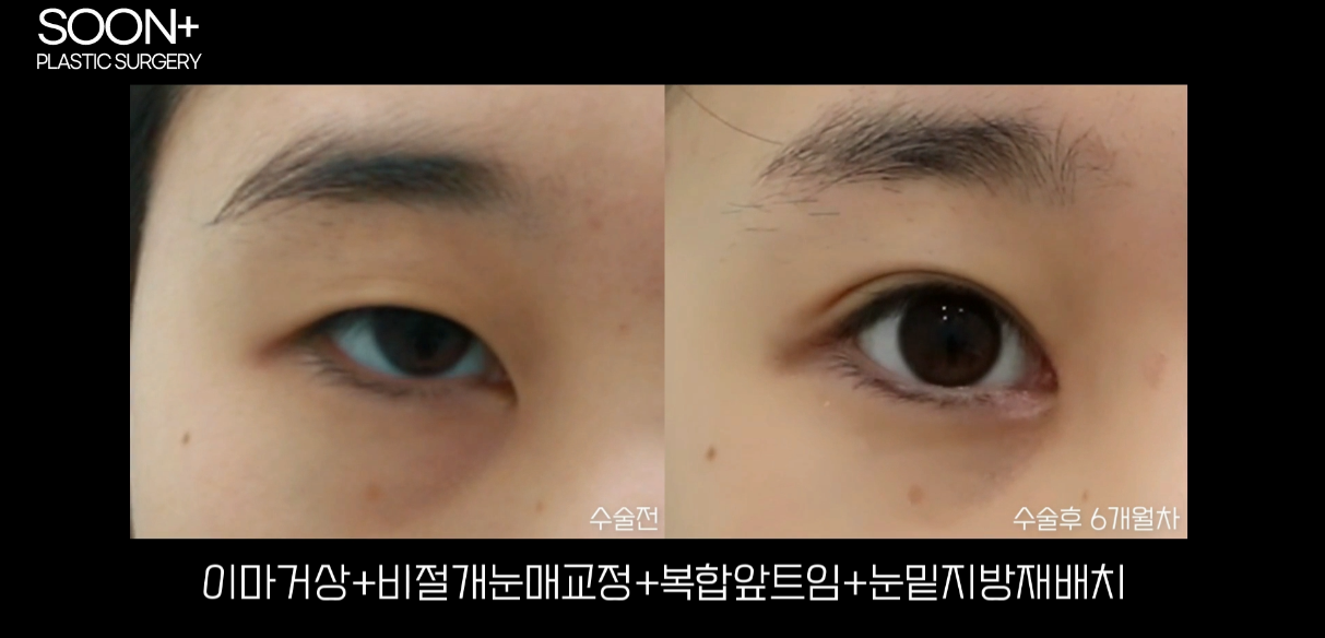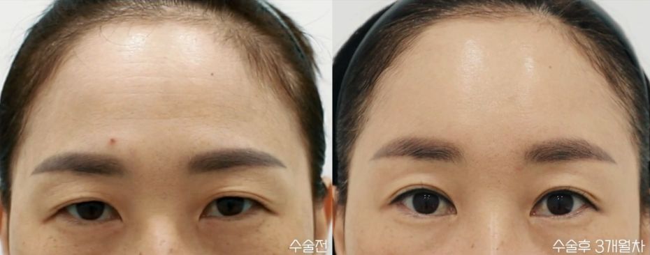 Hello, this is SoonPlus Plastic Surgery Clinic. Let’s take a look at the pre-surgery and 1-month post-surgery video of a patient who underwent a forehead lift at our clinic. Before the surgery, looking at the patient's eyes, we can see that the thick eyelids are covering the pupils, making the eyes look tired and sleepy. To open the eyes, the patient had to lift their eyebrows and forehea..